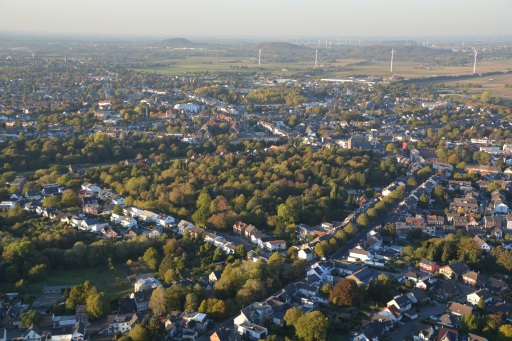 View over the center of Würselen, Tittelstraße in front, Alsdorf in the background